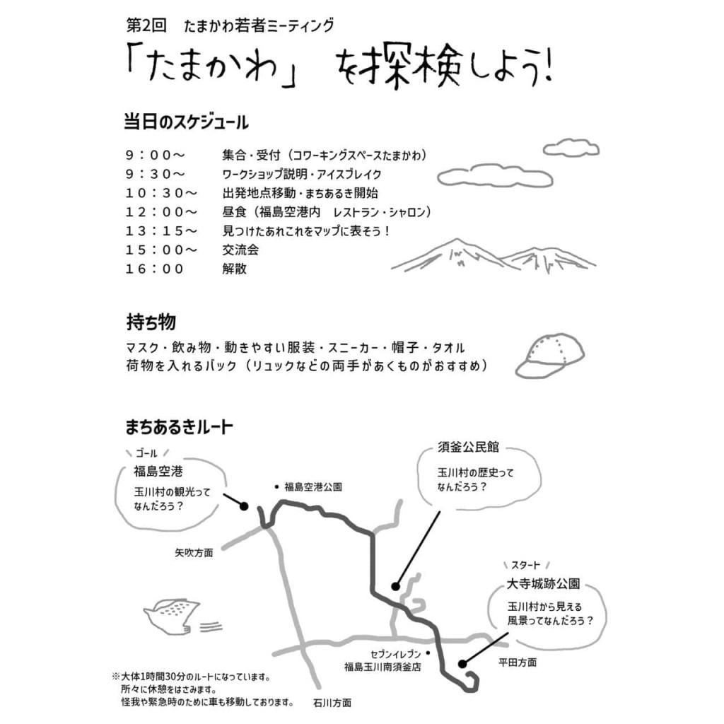 【お知らせ】 地域おこし協力隊 鈴木愛子さん主催 『第2回たまかわ若者ミーティング』を 令和3年11月28日(日) に開催いたします。 ↓↓詳細は下記をご覧ください。↓↓ ーーーーーーーーーーーーーーー 第2回たまかわ若者ミーティングを開催します! こんにちは!にぎわいプロモーション隊員の鈴木です。 玉川村(南須釜地区・北須釜地区)を実際に歩いて、参加者全員で探検マップを作るワークショップを行います。詳細は画像または以下の通りです。皆さんのご参加お待ちしております! 〈第2回 たまかわ若者ミーティング〉 【日 時】 2021年11月28日(日) 9:30~16:00 【場 所】 ワーキングスペースたまかわ 福島県石川郡玉川村大字南須釜字奥平290 【定 員】 5名(定員に達し次第お申込み終了) 【対 象】 中学生~40歳未満 【参加費】 1000円(昼食代として) 【持参物】 マスク タオル 帽子 動きやすい服装・スニーカー・飲み物・荷物を入れるバック(リュックなどの両手が空くものがおすすめ) 【お申し込み方法】 下記画像のQRコードを読み込んで申し込みフォームに記入して頂くか、直接・電話・メールでのお申し込みも受け付けています。 【お申込み期限】 11月24日(水)まで (定員に達し次第お申込み終了) 【主催】 玉川村地域おこし協力隊 鈴木愛子 【協力】 学生団体 Krei-Agri 【お問い合わせ先】 玉川村地域おこし協力隊 鈴木愛子 TEL 090-2027-4914 MAIL tamakawa.okoshi@gmail.com
